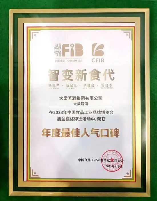 經中輕食品工業管理中心中國食品工業品牌博覽會“馥蘭德獎”評審委員會專家組評審,大梁茗酒獲得兩項殊榮: